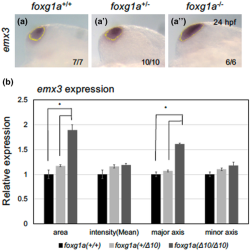 Semi-quantitative analysis of emx3 expression in foxg1a mutants. The emx3 expression pattern in the telencephalon was quantified by ImageJ. After selecting stained regions based on a brightness threshold (a–a‴, yellow line), the areas, staining intensities, major axes, and minor axes were quantified for respective genotypes. (a–a‴) Wild type (+/+), a heterozygous mutant (+/−), and a homozygous mutant (−/−) are shown in this order from left to right. At the bottom right are shown the numbers of embryos with the indicated patterns and those of embryos with the indicated genotypes. The embryos in (a) and (a”) correspond to those in Figure 5c, c′. Lateral views of the head with anterior to the top. Scale bar, 100 μm. (b) Quantification of the emx3 expression patterns. Average values for each genotype are shown relative to the average for wild-type embryos, with error bars showing SEMs. *p < .05.