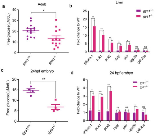 Loss of gys1 impaired the glucose metabolism in zebrafish. (a and c) Plasma free glucose levels in 120 dpf F2 adults (gys1 WT n = 14, gys1 MT zebrafish n = 14) and F3 embryos at 24 hpf (gys1WT n = 4, gys1MT n = 4). (b and d) Loss of gys1 impaired the mRNA levels of glucose metabolism related genes in 120 dpf adult liver (n = 4) and embryos (n = 4), respectively. Unpaired t-test was used as the statistical analysis. Gluconeogenesis genes: g6pc1a.1 glucose-6-phosphatase catalytic subunit 1a; pck1 phosphoenolpyruvate carboxykinase 1; pck2 phosphoenolpyruvate carboxykinase 2 (mitochondrial), Glycolysis genes: pklr pyruvate kinase L/R; pygl phosphorylase, glycogen, liver; Glycogenolysis and glycogen synthesis genes: ugp2b uridine diphosphate glucose pyrophosphorylase; gsk3ba glycogen synthase kinase 3 beta. (*p < 0.05 **p < 0.01 ***p < 0.001 ****p < 0.0001 ns: no significant difference).
