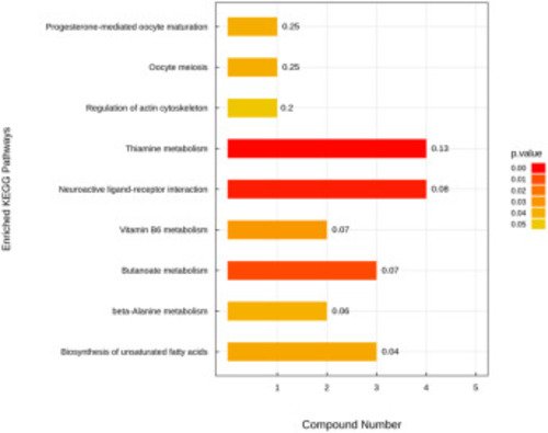 Enriched KEGG pathway analysis revealed by Untargeted metabolomics. KEGG pathway analyzed with MetaboAnalyst 5.0 for the different expressed metabolic profiles between gys1 WT and MT at 24 hpf. p value was determined by Fisher's Exact Test and indicated on the right. Compound number represents to the number of differentially expressed metabolites contained in each KEGG metabolic pathway. |
