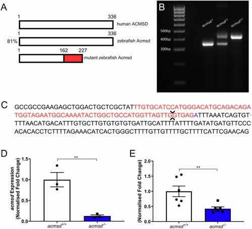 CRIPSR-generated mutation in acmsd causes nonsense-mediated decay of resulting mRNA. A Zebrafish express a single Acmsd protein, sharing 81% protein identity to human ACMSD. A mutation was introduced into exon 6 using CRISPR/Cas9 resulting in a predicted truncated protein. Red region depicts altered amino acids in the mutated protein. B The resulting 70 bp reduction in DNA length allowed for genotyping by standard PCR. acmsd+/+ zebrafish were identified by a single 425 bp band (right), homozygous acmsd-/- mutants by a 355 bp band (left), and heterozygous acmsd+/- mutants by a double band (centre). C DNA sequence of acmsd exon 6 and intron 6. acmsd-/- zebrafish possessed a 71 bp deletion (red) and 1 bp insertion (blue) in this region, resulting in the loss of a 3’ splice site (arrows). acmsd-/- larvae demonstrated reduced acmsd expression compared to their acmsd+/+ siblings at 5dpf (D, n = 3 biological replicates (15 larvae per replicate), p = 0.0012) and in adult brain tissue (E, n = 6 biological replicates (1 brain per replicate), p = 0.0040). Statistics from two-tailed t tests using ddCt values.