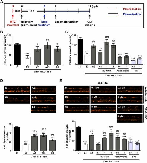 Pharmacological control of the TGF-β1 signaling pathway affects locomotor activity and oligodendrocyte regeneration. (A) Schematic representation of the treatment protocols using Tg(mbpa:qf2;quas:epntr-p2a-mcherry) zebrafish larvae. The zebrafish larvae were treated with 2 mM metronidazole (MTZ) for 18 h 5 days post-fertilization (dpf). After that, they were maintained in E3 medium and treated with AZ-12601011 (10 nM), A83–01 (10 nM), SB-505124 (50 nM), (E)-SIS3 (0.1, 1, and 5 μM), asiaticoside (0.1 and 1 μM), and SRI-011381 (0.1 and 1 μM) for 1 and 4 days. (B) Effects of TGF-βRI kinase inhibitors on distance moved 9 dpf. (C) Changes in distance moved at 9 dpf when the TGF-β signaling pathway was inhibited by pharmacological drugs. (D, E) Lateral views of the spinal cord of transgenic zebrafish larvae at 12 dpf, anterior to the left and dorsal to the top. In the spinal cord, fluorescence indicates mbpa+-OLs. The graphs show the number of oligodendrocytes (OLs) in each 4-somite area. The experiment was repeated thrice. The data are presented as the mean ± SD; n ≥ 10 independent experiments. P-values were calculated using one-way ANOVA followed by Tukey’s test. Significance is indicated by *P < 0.05, **P < 0.01, and ***P < 0.001 vs. DMSO; #P < 0.05, ##P < 0.01, and ###P < 0.001 vs. MTZ 18 h + E3. Scale bar: 200 μm. |