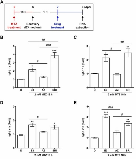 TGF-βRI kinase inhibitor downregulates TGF-β1 and TGF-βRI mRNA expression levels post-demyelination. (A) Schematic representation of the treatment protocols using Tg(mbpa:qf2;quas:epntr-p2a-mcherry) zebrafish larvae. (B-E) RT-qPCR results for tgf-β1a, tgf-β1b, tgf-βr1a, and tgf-βr1b mRNA expression. The experiment was repeated thrice. The data are presented as the mean ± SD; n ≥ 20 independent experiments. P-values were calculated using one-way ANOVA followed by Tukey’s test. Significance is indicated by *P < 0.05, **P < 0.01, and ***P < 0.001 vs. DMSO; #P < 0.05, ##P < 0.01, and ###P < 0.001 vs. MTZ 18 h + E3 or MTZ 18 h + AZ. |