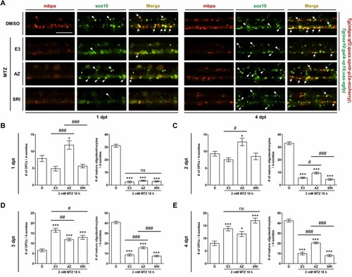 TGF-βRI kinase inhibitor increases the number of oligodendrocyte progenitor cells early after demyelination. (A) Lateral views of the spinal cord of transgenic zebrafish larvae at 1 and 4 days post-treatment (dpt), anterior to the left and dorsal to the top. In the spinal cord, fluorescence indicates sox10+-OPCs (arrowhead) and mbpa+sox10+-mature oligodendrocytes (OLs) (arrow) in each 2-somite area. (B-E) Numbers of sox10+- and mbpa+sox10+-cells in each 4-somite area 1–4 dpt. The experiment was repeated thrice. The data are presented as the mean ± SD; n ≥ 8 independent experiments. P-values were calculated using one-way ANOVA followed by Tukey’s test. Significance is indicated by *P < 0.05 and ***P < 0.001 vs. DMSO; #P < 0.05, ##P < 0.01, and ###P < 0.001 vs. MTZ 18 h + E3 or MTZ 18 h + AZ. ns: not significant. Scale bar: 200 μm.