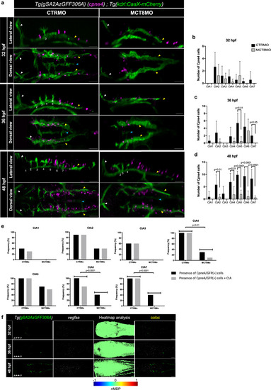 MT3 regulates Cpne4+ cells during hindbrain vasculature development. a Maximum projection of the hindbrain vasculature structures in double transgenic zebrafish embryos (Tg(kdrl:CaaX-mCherry);Tg(gSA2AzGFF306A)) immunostained against mCherry (green) and GFP (Cpne4+ cells, magenta) are shown. In CTRMO zebrafish embryos, Cpne4/GFP(+) cells were in close contact with the central arteries (CtAs), while in MCT8MO zebrafish embryos some Cpne4/GFP(+) cells were lost. The white arrowhead indicates the mid-cerebral vein (MCeV), the yellow arrowhead indicates the primordial hindbrain channels (PHBC), and the blue arrowhead indicates the basilar artery (BA). White numbers 1 – 7 indicate the developed CtA in its respective rhombomere. The number of Cpne4/GFP(+) cells between CTRMO and MCT8MO zebrafish embryos was analyzed at b) 32 hpf (n = 9, 8 (CTRMO, MCT8MO)), c) 36 hpf (n = 5, 6 (CTRMO, MCT8MO)) and d) 48 hpf (n = 7, 10 (CTRMO, MCT8MO)); Unpaired t-test; Error bars represent standard deviation. e Graphical view of the correlation between the presence of Cpne4/GFP(+) cells and the presence of each CtA in CTRMO and MCT8MO at 48 hpf shows that a correlation between these two conditions exists for CtAs 4, 6 and 7. Fisher’s exact test. n = 7 (CTRMO), 11 (MCT8MO). For detailed statistics, see Supplementary Data 2. f Dorsal view of the hindbrain of Tg(gSA2AzGFF306A) zebrafish embryos at 32, 36 and 48 hpf after WISH for vegfaa (white) and immunostained against GFP (Cpne4 cells, green) are shown. Heatmap colocalization analysis was used using normalized mean deviation product (nMDP) values and a combined image between GPF and vegfaa expression is shown. Color bar chart indicating no colocalization (-1, blue color) to colocalization (1, red color). Scale bar: 50 μm.