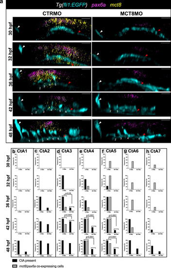 pax6a-expressing cells colocalize with T3 transporter mct8. a Lateral view of maximum projection images of fluorescent double WISH against pax6a (magenta) and mct8 (yellow) and immunostaining against GFP (endothelial marker, cyan) in Tg(fli1:EGFP) CTRMO and MCT8MO zebrafish embryos at 30, 32, 36, 42 and 48 hpf. The hindbrain of CTRMO and MCT8MO zebrafish embryos were analyzed for colocalization of pax6a with mct8-expressing cells (white dotted circles) during BHB development at different time points. Colocalization was determined by using the colormap colocalization plugin of Fiji software in the region of every CtA. The white arrowhead represents the mid-cerebral vein (MCeV) and the red arrowhead represents the primordial hindbrain channels (PHBC). Numbers 1 – 7 indicate the CtA in its respective rhombomere. Scale bar: 50 μm. During the different time points of BHB development, the presence and absence of CtA 1 (b), CtA 2 (c), CtA 3 (d), CtA 4 (e), CtA 5 (f), CtA 6 (g), CtA 7 (h) and pax6a/mct8 co-expressing cells were analyzed and the correlation was determined. Statistical significance was determined using Fisher’s exact test. n = 3 (36 hpf MCT8MO), 4 (30 hpf CTRMO/MCT8MO, 32 hpf CTRMO, 36 hpf CTRMO), 5 (32 hpf MCT8MO, 42 hpf CTRMO/MCT8MO, 48 hpf CTRMO/MCT8MO)). For detailed statistics, see Supplementary Data 2.
