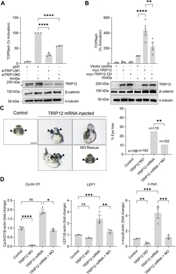 TRIP12 promotes Wnt signaling in human cells and zebrafish.A HEK293STF cells were transfected with nontargeting (siNT) or two independent TRIP12 siRNAs (siTRIP12#1 and #2) and incubated in the presence or absence of recombinant Wnt3a. TOPflash reporter activity quantified, and cell extracts immunoblotted for TRIP12 and β-catenin. α-tubulin is a loading control. *indicates a nonspecific band. Graphs show mean ± SEM of TOPflash normalized to cell number and control. Significance assessed using one-way ANOVA with Dunnett’s test. p-values for siNT + Wnt3a versus siTRIP12#1 and siTRIP12#2 are <0.0001. TOPflash and immunoblots represent at least three independent experiments. n = 3 wells of cells per treatment group per experiment, as shown in the dot plot. B HEK293STF cells transfected with empty vector control or plasmids encoding Myc-TRIP12 wild-type (WT) or Myc-TRIP12 catalytic-dead (CD) and incubated in the presence or absence of recombinant Wnt3a. TOPflash reporter activity quantified, and cell extracts immunoblotted for TRIP12 and β-catenin. α-tubulin is a loading control. Graphs show mean ± SEM of TOPflash normalized to cell number and control. Significance assessed with one-way ANOVA with Tukey’s test. p-value for myc-TRIP12 + Wnt3a versus control +Wnt3a is <0.0001 and for myc-TRIP12 + Wnt3a versus myc-TRIP12 CD + Wnt3a is 0.0028. C Zygotes injected with TRIP12 mRNA. Rescues were co-injected with TRIP12 MO. Representative images are shown on the left, with arrows indicating developing eyes. The percentage of eyeless embryos is graphed on the right. Scale bar = 200 mm. Significance analyzed by Fisher’s exact test (two-sided), p-value is 0.0081. D Co-injection with mRNA and MO rescues expression of Cyclin D1, Lef1, and c-myc. Total mRNAs isolated from injected single embryos, and Cyclin D1, Lef1, and c-myc levels quantified by RT-qPCR. Gene expression is graphed as ratio to β-actin control and normalized to uninjected embryo controls. Graphs show mean ± SEM, n = 3 independent embryo pools. Significance assessed using one-way ANOVA with Tukey’s test. p-values for Control versus TRIP12 MO, Control versus TRIP12 mRNA, TRIP12 mRNA versus TRIP12 mRNA + MO are 0.0000085, 0.092147, 0.0430227 for Cyclin D, 0.0947633, 0.0003199, 0.0033959 for Lef1, 0.0072358, 0.0002207, 0.0005341 for c-myc. *p < 0.05, **p < 0.01, ***p < 0.001, ****p < 0.0001, p ≥ 0.05 not significant (ns). Source data provided.