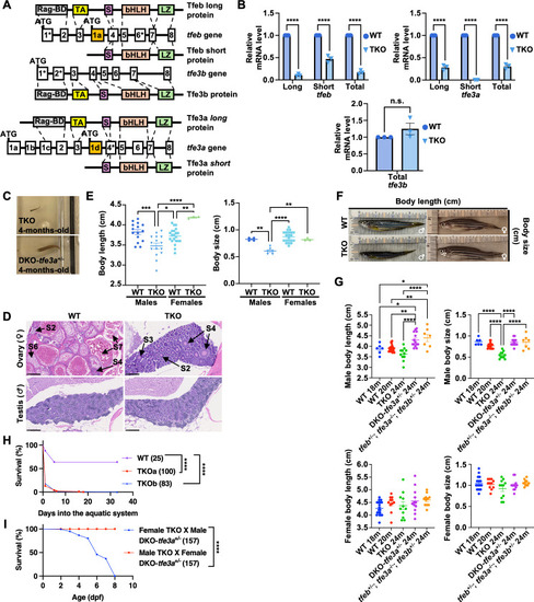 Generation of zebrafish tfeb, tfe3a and tfe3b triple knockout mutants. (A) Genomic coding structure of the zebrafish tfeb, tfe3a and tfe3b genes and schematic illustration of the major structural domains of their different forms. The coding exons targeted in genome-editing using CRISPR/Cas9 have been marked with asterisks, alternative first coding exons are highlighted in orange. Exons/introns are not drawn to the scale. RAG-BD, RAG binding domain; TA, transactivation domain; S, 14-3-3 binding motif; bHLH, beta Helix-Loop-Helix; LZ, leucine zipper domain. (B) Real-time qPCR analysis showing reduction of tfeb, tfe3a and tfe3b expression in 2 dpf TKO embryos. The data represent means ± SEM, n = 3 independent experiments. Statistical significance was determined by using two-way ANOVA with Sidak’s multiple comparisons. n.s., not significant, **** < 0.0001. (C) Representative pictures of a 4-months-old TKO fish (top) and its sibling fish (bottom) in a DC-96 genotyping tank. (D) Comparison of H&E-stained longitudinal sections of WT and TKO 4-months-old fish embedded in paraffin. (Top) Representative pictures of the ovary of TKO small adult female fish showing the lack of mature oocytes in the TKO ovaries. Different stages of primary oocytes (S2, S3, S4, S6 and S7) are indicated. S2, S3 represent the previtellogenic stages; S6 and S7 are the last stages of oocytes maturation. (Bottom) Representative pictures of testis of 4-months-old control and TKO small adult male fish. Scale bars, 250 μm. (E) Comparison of body length (left) and body size (right) between 12-months-old WT and TKO male and female fish. The data represent means ± SEM. Statistical significance was determined by Welch’s two-tailed t-test. * < 0.05, ** < 0.01, *** < 0.001 and **** < 0.0001. (F) Representative pictures of 12-months-old WT and TKO fish used for the quantification in (E). (G) Comparison of body length and size among different males (top panels) and female (bottom panels) adult fish. WT used are 18- and 20-months-old, TKO and their siblings are 24-months-old. The data represent means ± SEM. Statistical significance was calculated using ordinary one-way ANOVA with Tukey’s multiple comparison test, with a single pooled variance. * < 0.05, ** < 0.01, *** < 0.001 and **** < 0.0001. (H) Kaplan-Meier curves showing the percentage of survival (y axis) of WT and TKO embryos (TKOa and TKOb) through time (x axis) while growing into the aquatic system from 6 dpf (time point 0). Numbers in parenthesis indicate the number of embryos used. (Log-rank (Mantel-Cox) test: **** < 0.0001). (I) Representative Kaplan-Meier curves showing the percentage of survival (y axis) of the embryos from two different crosses through time (x axis). Numbers in parenthesis indicate the number of embryos used. (Log-rank (Mantel-Cox) test: **** < 0.0001).