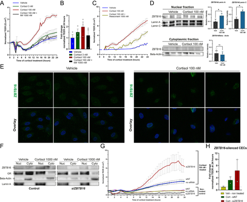 Cortisol, via GR, enhances endothelial barrier integrity, and this effect is exaggerated after ZBTB16 silencing. (A) Cortisol dose-dependently increased the barrier integrity of primary CECs measured by TEER, and this was blocked by mifepristone (Mif) (n = 3 individual donors). The spectra were normalized to the TEER value 1 h before the treatment (mean ± S.E.M). (B) The fold change of cortisol effect on average TEER value across group of treatments (mean ± S.E.M). (C) Co-incubation with 1,000 nM of the selective GR antagonist, relacorilant, attenuated endothelial barrier integrity induced by 100 nM cortisol (mean ± S.D). (D) After 24 h, 100 nM cortisol (Cort) induced ZBTB16 protein expression in the nuclear fraction compared to the vehicle treatment (mean ± S.D). (E) Representative images of immunofluorescence staining of primary CECs (donor 6) that were treated with vehicle or 100 nM cortisol for 24 h. ZBTB16 (green) was present in the DAPI-stained nuclei (blue) after cortisol treatment. (F) Induction of ZBTB16 protein expression after 24 h of 1,000 nM cortisol treatment in the nuclear (Nuc) fraction was absent in ZBTB16-silenced CECs (48 h post-transfection). (G) In the ZBTB16-silenced CECs, the cortisol-induced increase in barrier integrity (normalized TEER value) was exaggerated after 24 h of treatment compared to the WT CECs (n = 2 individual donors, mean ± S.E.M). (H) The fold change of cortisol effect on average TEER value from ZBTB16-silenced CECs (mean ± S.E.M). Each experiment was performed in 3–4 technical replications. siNT: non-target control siRNA, siRNA: small interfering RNA, siZBTB16: siRNA ZBTB16, veh: vehicle.
