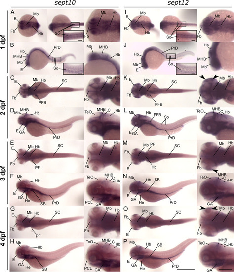 Expression pattern of sept10 and sept12 revealed by RNA WISH in zebrafish embryos and early larvae. Zebrafish embryos stained for sept10 or sept12 expression by RNA WISH at 1–4 dpf shown in dorsal (upper image) or lateral (lower image) view. Magnified views of the head structure are shown as enlarged images. Boxed images show somites (So) at a higher magnification. A-H: larvae exhibited early sept10 expression in anterior ventral structures, brain and in single So at 1 and 2 dpf. At 3 and 4 dpf expression was detectable mostly in the gill arches (GA) and in the brain. I - P: sept12 expression was visible in ventral structures and single somites (So) at 1 dpf and elevated in brain and pronephric duct (PrD) at 2 dpf. Expression in pronephric duct (PrD) persisted at later stages, while brain expression was only weakly detectable at 3 and 4 dpf and persisted only at the mid-hindbrain boundary (MHB). K, M and O: Arrowheads show staining around the lens in the developing eye. See list for abbreviations. Scale bars: whole mounts: 500 μm, boxed images: 50 μm, enlarged head views: 200 μm. |