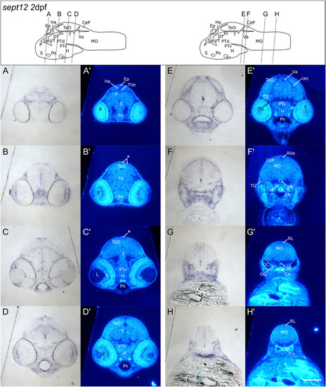 Transverse sections of 2 dpf zebrafish larvae showing detailed sept12 expression in the CNS. A–H: Transverse sections of sept12 labeled 2 dpf zebrafish (A–H). Sections were in addition stained with Hoechst 33258 for better visualization of distinct brain areas (A’ - H′). Level and angle of each section are displayed in the brain scheme above. Bright field images show sept12 expression in cells along the ventricle (A + B) and in several brain regions including habenula (Ha), pallium (P), subpallium (S in A), zones around the lens (L) and in the optic nerve (on in C). Sept12 expression was also visible at a dorsal region of the tectum opticum (TeO) (asterisk), tegmentum (T), hypothalamus (H) and posterior tuberculum ventral part (PTv in D). Furthermore, cells in the cerebellar comissure (cec), cerepellar plate (CeP), torus semicircularis (TS in E − F) and rhombic lip (RL) (G) showed sept12 expression. Prominent sept12 expression was also detected in the superior Raphe nucleus (SR) (F–G). Scale bar: 100 μm. See list for abbreviations. Brain schemes were adapted from Mueller and Wullimann, 2016). |