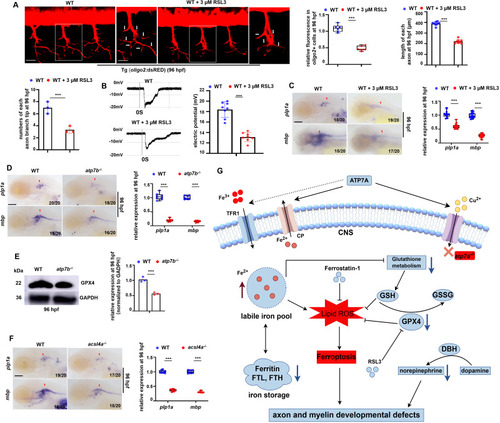 Effects of unbalanced copper homeostasis and copper non-related ferroptosis on CNS myelin and axon development. (A) oligo2+ cells and the axons in Tg (WT; olig2: dsRED) larvae treated with or without GPX4 inhibitor RSL3 at 96 hpf, and the calculation of the relative fluorescence levels in oligo2+ cell bodies and axons (left), the relative length of axons (right), and the numbers of branch tips in each axon (down)(graphs). (B) Neurons in WT or RSL3 stressed larvae differed in current amplitudes at 96 hpf, with neurons in WT larvae having significantly larger current amplitudes and densities (graphs). (C) Transcriptional expressions of CNS myelin markers mbp and plp1a in WT or RSL3-treated larvae at 96 hpf, and the calculation of the relative expression of mbp and plp1a (box and whisker plots). (D) Transcriptional expressions of CNS myelin markers mbp and plp1a in WT or atp7b−/− larvae at 96 hpf, and the calculations of the relative expressions of mbp and plp1a (box and whisker plots). (E) Western blotting (WB) analysis of the relative protein level of GPX4 in WT or atp7b−/− at 96 hpf, with GADPH as an internal control (graphs). (F) Transcriptional expressions of CNS myelin markers mbp and plp1a in WT or acsl4a−/− larvae at 96 hpf, and the calculations of the relative expressions of mbp and plp1a (box and whisker plots). (G) Working model of atp7a deficiency in inducing developmental defects in axonal and myelin development via ferroptosis in zebrafish. Atp7a functional deficiency leads to damaged iron homeostasis (iron overload) and increased lipid peroxidation, and the subsequent down-regulation of GPX4 and the resulted in ferroptosis in zebrafish larvae, especially in CNS OPCs, and then leads to axon myelin and extension developmental defects and dysfunctional locomotor in zebrafish. C, D, F, lateral view, anterior to the left. Scale bar: 50 μm (A), 10 μm (A, enlarged picture), 100 μm (C, D, F). *P < 0.05, **P < 0.01, ***P < 0.001. NS, not significant.