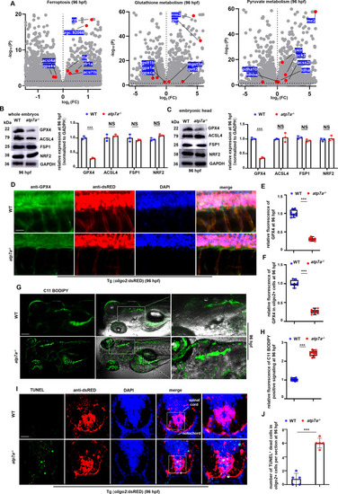 Atp7a deficiency leads to ferroptosis and significant downregulation of GPX4. (A) Scatter plots for ferroptosis genes (left), glutathione metabolism genes (middle), and pyruvate metabolism genes (right) in atp7a−/− larvae at 96 hpf. (B) WB analysis of the relative protein levels of GPX4, ACSL4, FSP1, and NRF2, indicators for ferroptosis, in whole WT or atp7a−/− larvae at 96 hpf, respectively, with GADPH as an internal control (graphs). (C) WB analysis of the relative protein levels of GPX4, ACSL4, FSP1, and NRF2 in the head of WT or atp7a−/− larvae at 96 hpf, with GADPH as an internal control (graphs). (D) Double staining of oligo2+ cells (RED) with GPX4 (GFP) in WT or atp7a−/− larvae at 96 hpf, and the calculation of the relative fluorescence levels of GPX4 (E) and GPX4 fluorescence intensity in oligo2+ cells (F) (box and whisker plots). (G, H) Lipid peroxidation indicator C11 BODIPY staining in WT or atp7a−/− larvae at 96 hpf (H), and the calculation of the relative fluorescence of C11 BODIPY positive signaling in spinal cords at 96 hpf (box and whisker plots) (H). (I) Double staining of oligo2+ cells (RED) with TUNEL signals (green dots) in WT or atp7a−/− larvae at 96 hpf, and the calculation of the number of TUNEL positive signals in the spinal cord (slides) at 96 hpf (graphs) (J). Slides are trans-sections at hindbrain domain. Loci with spinal cords (G, I) in white boxes were amplified. Scale bar: 50 μm (D), 200 μm (G), 100 μm (I, amplified panels in G), 20 μm (amplified panels in I). *P < 0.05, **P < 0.01, ***P < 0.001. NS, not significant. (For interpretation of the references to colour in this figure legend, the reader is referred to the web version of this article.)