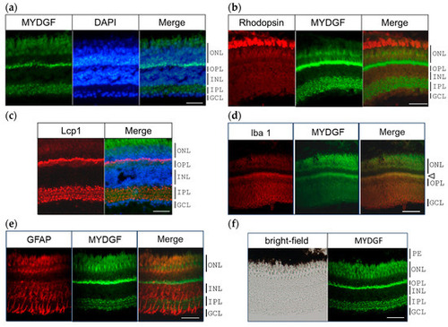 MYDGF-producing cells in the zebrafish retina 1 h after ONI. (a) Double fluorescence staining of MYDGF (green) and nuclear staining with DAPI (blue). The MYDGF-positive cells included photoreceptors in the ONL, the border of the ONL and OPL, and the cells in the IPL (Figure 2a). (b) Fluorescent double staining of the photoreceptor marker proteins rhodopsin (red) and MYDGF (green). (c) Triple fluorescence staining of MYDGF (green), nuclear staining with DAPI (blue), and leukocyte marker Lcp1 (red). Lcp1 clearly colocalized with the MYDGF-positive distribution at the ONL-OPL border regions and in the IPL. (d) The microglial marker protein Iba1 colocalized with the MYDGF-positive region at the ONL-OPL border regions (indicated by the arrowhead). (e) GFAP-positive Müller cells showed almost no co-localization with MYDGF. (f) The pigment epithelium (PE), observed as black under brightfield microscopy, was found to lack MYDGF production. Representative images from 3–4 independent experiments of IHC are shown. Scale bar = 50 μm.