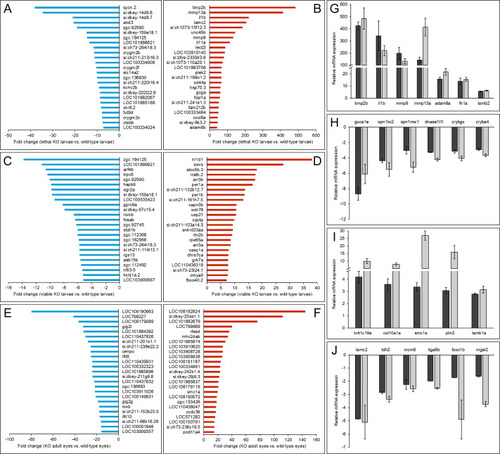 Top 50 DEGs in adamtsl4 KO zebrafish identified by RNA-seq analysis and confirmation by RT-qPCR of the differential expression of selected genes. A-B. Downregulated genes and upregulated genes, respectively, in 6 dpf lethal adamtsl4 KO larvae vs. wild type larvae. C-D. Downregulated genes and upregulated genes, respectively, in 6 dpf wild type-like adamtsl4 KO larvae vs. wild type larvae. E-F. Downregulated genes and upregulated genes, respectively, in eyes of 5-month adamtsl4 KO zebrafish vs. wild type zebrafish. G-H. Confirmation by qRT-PCR of differential gene expression of selected upregulated and downregulated genes, respectively, in lethal adamtsl4 KO larvae vs. wild type larvae. I-J. Confirmation by qRT-PCR of differential gene expression of selected upregulated and downregulated genes, respectively, in eyes of 5-monts adamtsl4 KO zebrafish vs. wild type zebrafish. Aliquots of RNA preparations used for transcriptomic analyses were used as templates in qRT-PCR that was carried out in triplicate. |