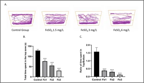 Ferrous Sulphate (1.5, 3, and 6 mg/L) impaired the locomotion and increased the anxiety levels in the zebrafish when subjected to novel tank test (A) Illustration of representative locomotion tracking pattern (Novel tank test) of the Control group and FeSO4 (1.5, 3, and 6 mg/L) treated groups. (B) Graphical representation of the total time spent by the zebrafish in the top zone of the novel tank. (C) Graphical representation of the Ratio of time spent in the Top/Bottom zone in the different groups. Data are represented as means ± S.E.M. (n = 10). For Bonferroni’s post hoc analyses: (B) Control vs. Fe1(1.5 mg/L): *** p < 0.0001, Control vs. Fe2(3 mg/L): *** p < 0.0001, Control vs. Fe3(6 mg/L): *** p < 0.0001. (C) Control vs. Fe1(1.5 mg/L): *** p < 0.0001, Control vs. Fe2(3 mg/L): *** p < 0.0001, Control vs. Fe3(6 mg/L): *** p < 0.0001