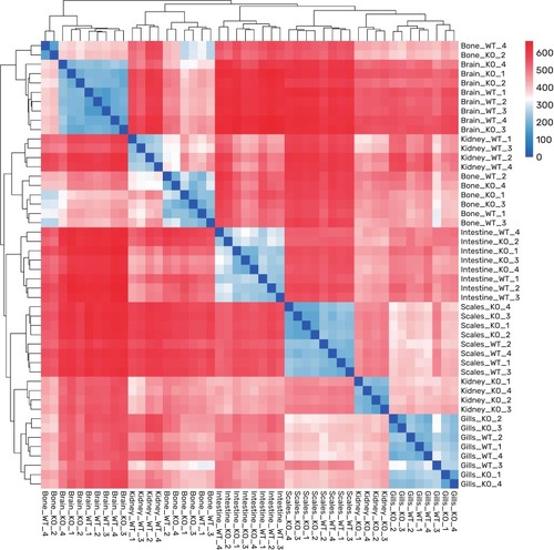 Global Overview of RNA-sequencing Data. Sample-to-sample distance heatmap. Clear within-tissue clustering is evident, with kidney samples displaying the most significant transcriptional divergence. |