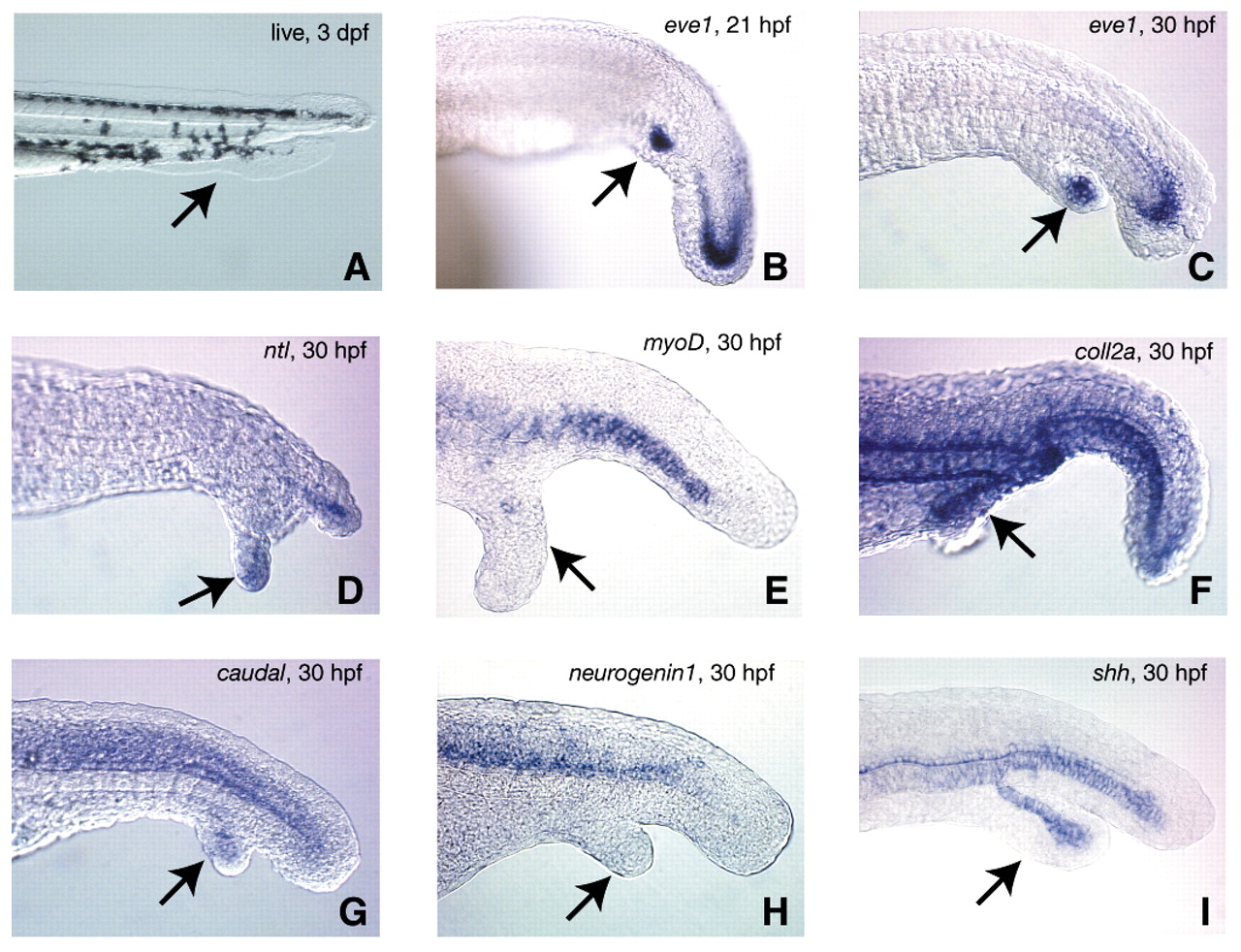 Fig. 5 Analysis of gene expression in the ectopic tails. Embryos were heatshocked from shield to bud stage to maximize ectopic tail formation, then photographed live at 3 dpf (A), or fixed at either 21 hpf (B) or 30 hpf (C-I). Expression of eve1 (B,C), no tail (ntl; D), myod (E), collagen 2a (coll2a; F), caudal (G), neurogenin1 (H), or sonic hedgehog (shh; I). Arrows in each panel indicate the location of the ectopic tail. In A note the presence of both fin and pigment tissue in the secondary tail. In all other panels except H note the expression of each corresponding gene in the ectopic tails. ntl expression in D was localized only to the tailbud of the ectopic tail. All images except I are representative of the majority of ectopic tails examined. We observed sonic hedgehog-expressing cells in 44% (n=16) of ectopic tails.