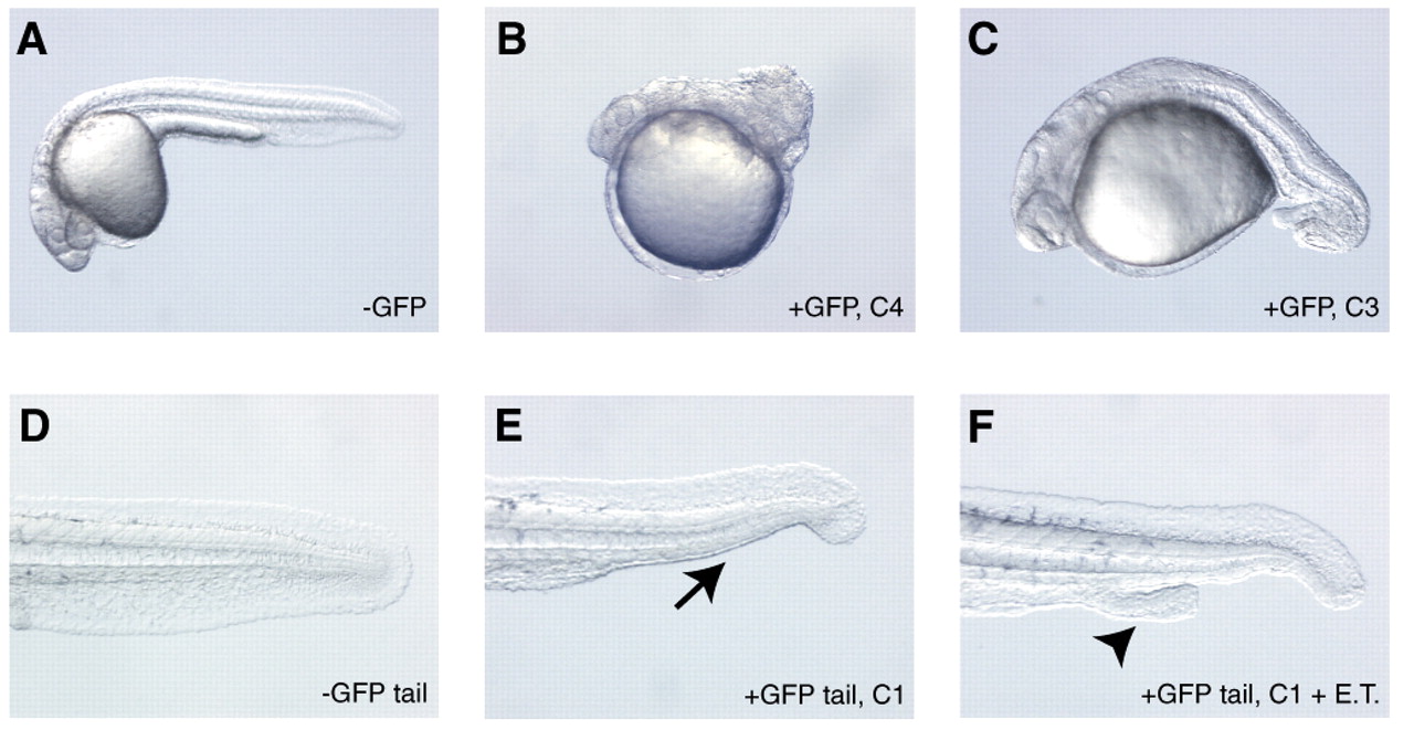 Fig. 2 Phenotypes caused by reducing Bmp signaling at various developmental stages. Embryos from a transgenic outcross were heatshocked in an air incubator at 3 hpf (A-C) or shield stage (D-F), and the GFP-positive embryos were sorted and scored for dorsalized phenotypes at 30 hpf. Note the fully formed tail in the wild-type sibling (whole embryo in A, tail view in D). Transgenic embryos heatshocked at 3 hpf display both C4 (B) and C3 dorsalized (C) phenotypes. Note the curled trunk and tail in B and the curled tail in C. Transgenic embryos heatshocked at shield stage display either a C1 phenotype (E; arrow denotes loss of the ventral tail fin) or a C1 phenotype coupled with the formation of an ectopic tail (F; arrowhead denotes second tail). ET, ectopic tail.