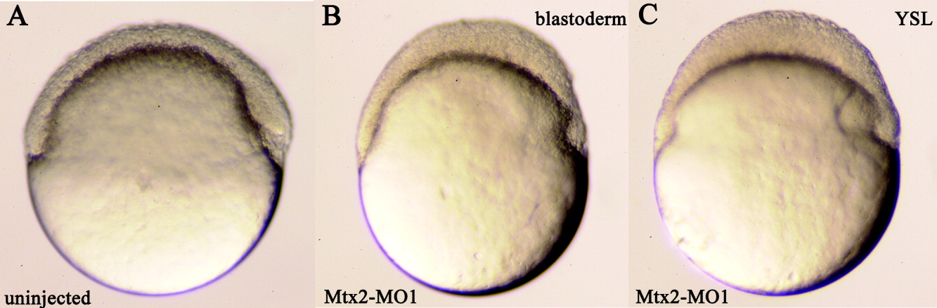 Fig. 4 mtx2 morpholinos inhibit epiboly. All views are lateral with dorsal to the right; all embryos are at shield stage (6 hours postfertilization). Injected construct, if any, is indicated in lower left corner. A: Uninjected embryo. B: Embryo injected with Mtx2-MO1 into one cell at the two-cell stage; note that the blastoderm is thickened compared with control. C: Embryo injected with Mtx2-MO1 into the yolk syncytial layer (YSL); note that the blastoderm is thickened compared with control.