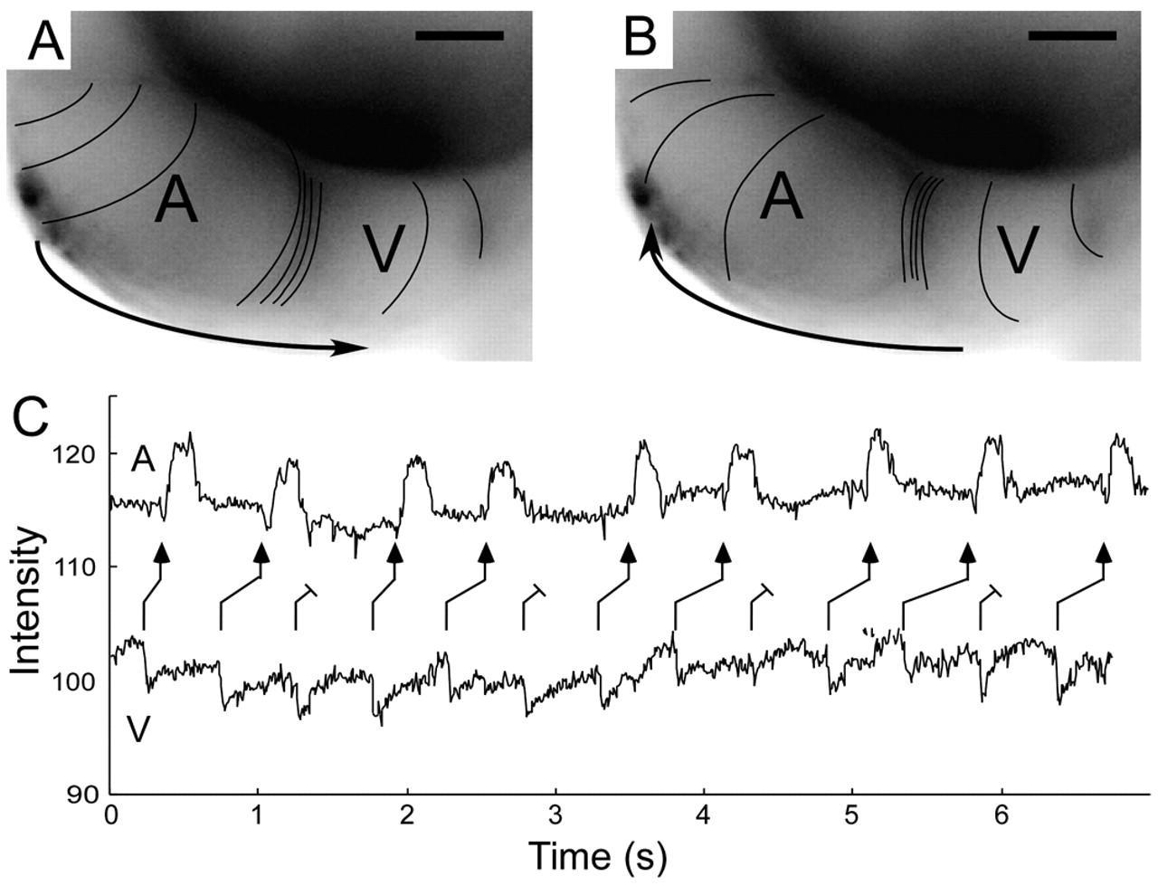 Fig. 2 Characteristics of retrograde conduction in the zebrafish heart at 48 hpf. (A,B) Calcium activation maps for normal anterograde cardiac cycle (A) and spontaneous premature ventricular beat (B). Both anterograde and retrograde AV delay are evident as compressed spacing of isochronal lines (100 msecond intervals). Scale bars: 50 μm. (C) Contemporaneous recordings of atrial and ventricular contraction using intensity-time plots from regions over the respective chambers, during ventricular pacing at 48 hpf. The ladder diagram depicts the resulting Wenckebach-type retrograde ventriculo-atrial block.