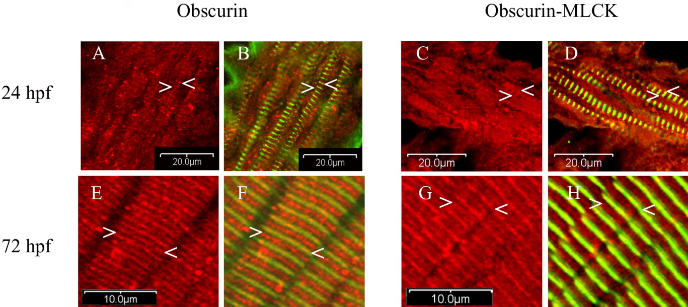 Fig. 3 Cellular distribution of obscurin and obscurin-MLCK in zebrafish skeletal muscle during development. Embryos were fixed at 24 (A-D), and 72 (E-H) hpf and co-immunolabeled with antibodies to the ankyrin binding domain of obscurin (Ank) (red: A,B,E,F) or the carboxy terminal kinase domain of obscurin-MLCK (link7) (red: C,D,G,H) and α-actinin (green: B,D,F,H). At 24 hpf, while most of the cellular obscurin and obscurin-MLCK remains diffusely localized, some begins to organize around the Z (A-D:<) and M bands (A-D:>) of the maturing myofibrils. It is important to note that all myofibrils with a striated pattern of α-actinin staining also demonstrate organization of some of the obscurin and obscurin-MLCK around the M and Z bands. Later in development, by 72 hpf, both obscurin and obscurin-MLCK demonstrate a more distinct striated pattern with obscurin more concentrated at the M bands (E-H:>) and obscurin-MLCK at the Z bands (E-H:<). Similar results were obtained using antibodies to the amino terminal immunoglobulin domains of obscurin (4A8) and the internal kinase domain of obscurin-MLCK (SKII). Scale bars = 20 (A-D) and 10 (E-H) μm.