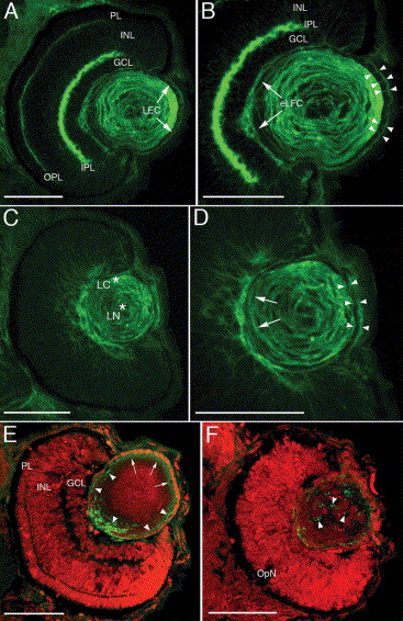 Fig. 6 Actin fails to localize properly in the morphant lens epithelial cells. Phalloidin-AlexaFluor 488 (A–D) was used to stain the filamentous actin in lenses and retinas of wild type (A, B) and morphants (C, D) at 3 dpf. In the control lens, actin is localized in a concentric pattern associated with the fiber cell membranes in both the nuclear and cortical regions (A, B). Lens epithelial cells (A, LEC) exhibit actin localization to both the distal (basal) and lateral aspects of the individual epithelial cells (B, arrowheads). Actin staining of the morphant lens reveals poorly defined elongating fiber cells (D, arrows) and a diffuse actin network in the lens epithelial cells (D, arrowheads). The sections also reveal intense actin staining within the retinal inner (IPL) and outer (OPL) plexiform layers (A, B), which is absent in the morphant (C). The lens-specific zl-1 monoclonal antibody labels the cortical region of the wild-type lens (E, arrowheads) and is localized near the apical–apical interface between the epithelial and fiber cells (E, arrows). In the morphant (F), the zl-1 protein is scattered throughout the lens and appears to be associated with the nucleated fiber cells (arrowheads). Abbreviations: PL, photoreceptor layer; INL, inner nuclear layer; GCL, ganglion cell layer; OPL, outer plexiform layer; IPL, inner plexiform layer; LEC, lens epithelial cells; eLFC, elongating lens fiber cells; OpN, optic nerve. Scale bars represent 50 μm.