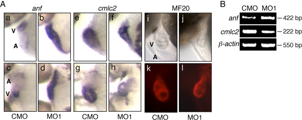 Fig. 6 The expression levels of anf and cmlc2 were altered in the zlrrc10 morphants. (A) CMO (a, c, e, g, i and k) and MO1 (b, d, f, h, j and l) injected zebrafish embryos at 2 dpf were subjected to whole-mount in situ hybridization using digoxigenin labeled anf (a–d) and cmlc2 (e–h) antisense riboprobes. Images of whole-mount immunostaining using MF20 antibody are shown in k and l. i and j are the same fields as k and l, respectively. c, d, g and h are ventral views and others are lateral views, all with anterior to the left. Note the marked increase in anf expression in the zlrrc10 morphant (b and d) but the reduction of cmlc2 expression in the morphant (f and h). A ventral view of the morphant clearly shows the small ventricle and a looping defect (h). (B) For quantitative analyses of gene expression, RT-PCR was performed on anf and cmlc2. β-actin was used as a control.