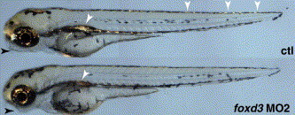 Fig. 2 Morpholino knockdown of Foxd3 expression. Gross loss of function phenotype: uninjected control larva (top panel) and injected with foxd3 morpholino (bottom panel). Black arrowheads indicate lower jaw, reduced in size in the foxd3 MO-injected larva. White arrowheads indicate iridophores that are reduced in the Foxd3 morpholino-injected larva.
