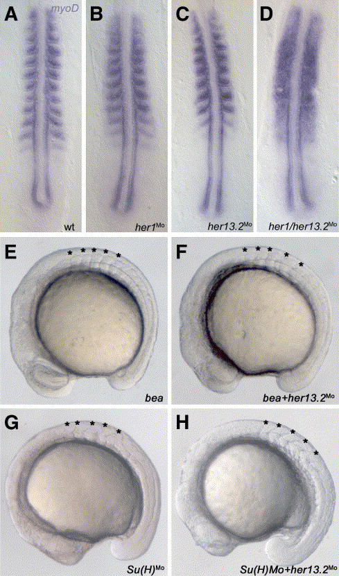 Fig. 3 Expression of myoD and somite border effects in the different morphants. (A) Wild-type expression of myoD, (B) in her1 morphants (0.6 mM; 2 experiments, n = 40, 95% show segmental myoD expression, which is slightly more diffuse in anterior somites), (C) in her13.2 morphants (0.6 mM; 2 experiments, n = 38, all embryos show segmental myoD expression) and (D) a full disruption of the myoD pattern in her1/her13.2 morphants (0.6 mM her1Mo + 0.6 mM her13.2Mo; 2 experiments, n = 57, 96.49% affected). Somite border disruption in (E) beatm98/deltaC mutants (van Eeden et al., 1996 and Jülich et al., 2005b), (F) her13.2Mo injections in beatm98/deltaC mutant background (0.6 mM; 2 experiments, n = 65, all embryos show bea phenotype), (G) Su(H) morphants (0.6 mM; 1 experiment, n = 40, 95% affected, showing the Su(H)Mo phenotype (Sieger et al., 2003)) and (H) Su(H)/her13.2 double morphants (0.6 mM Su(H)Mo + 0.6 mM her13.2Mo; 2 experiments, n = 52, 96.15% show Su(H)Mo phenotype). No enhanced effects could be observed in panels (F) and (H) when her13.2 morpholino was additionally injected compared to the single beatm98 mutant (E) or Su(H) morphant situation (G), respectively. (A–D) 8–10 somite stage embryos, flat mounted embryos, anterior to the top. (E–H) Whole-mount embryos, lateral view, anterior to the left. Stars in panels (E–H) mark the position of the somite borders.