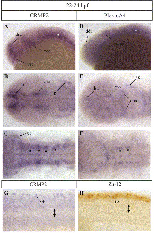 Fig. 4 Expression of zebrafish CRMP2 at 22–24 hpf, in comparison with PlexinA4. From 22 hpf, specific expression of CRMP2 is strongly detected in anterior neural structures including the drc, vrc, vcc, TG (A, B), and hindbrain (asterisk A, C). A comparison of CRMP2 and PlexinA4 expression shows overlapping expression in the drc, vcc, hindbrain, and TG (A–C versus D–F). PlexinA4 displays broader expression as it is also expressed in the dorsal diencephalon (ddi), and dorsal mesencephalon (dme). CRMP2 is clearly expressed in the RB cells from a lateral view (G), as compared to Zn-12 staining (H). Figures B, C, E, and F are de-yolked, dorsal views. The vertical double headed arrow denotes the boundaries of the notochord. Dotted white lines in L, M and N represent the boundaries of the zebrafish central nervous system. Abbreviations: drc (dorsal rostral cluster), vrc (ventral rostral cluster), vcc (ventral caudal cluster), RB (Rohon Beard cells), TG or tg (trigeminal ganglion), asterisk (hindbrain or hindbrain clusters).