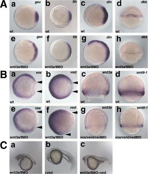 Fig. 2 Interaction between the Wnt3a/8 signaling and the ventrally expressed homeobox genes vox, vent, and ved for restriction of the dorsal organizer domain. (A) Expression of organizer genes in the wnt3a/wnt8 morphant embryos. The embryos received 4.2 ng each of wnt3aMO, wnt8-1MO, and wnt8-2MO (wnt3a/8MO, wnt3a/wnt8 morphant embryos) and were fixed at the shield stage. The expression of goosecoid (gsc), floating head (flh), and chordino (din) was expanded ventrally in the wnt3a/wnt8 morphant embryos compared with wild-type embryos (wt) or embryos receiving an injection of wnt3aMO (4.2 ng) alone (data not shown). In contrast, the expression of dickkopf1 (dkk1) was strongly reduced in the wnt3a/wnt8 morphant embryos. a–c, e–f animal pole views with dorsal to the right. d,h, Dorsal views. (B) Expression of vox and ved in the wnt3a/wnt8 morphant embryos, and expression of wnt3a and wnt8 in the vox/vent/ved morphant embryos. The vox/vent/ved triple morphant embryos were prepared by injecting 0.3 ng each of voxMO, ventMO, and vedMO, as published previously (Shimizu et al., 2002). a, b, e, f, shield stage, animal pole views with dorsal to the right. c, d, g, h, 80% epiboly stage, lateral views with dorsal to the right. Arrowheads indicate the dorsal limit of the vox and ved expression. The expression of vox and ved was reduced on the dorsal side in the wnt3a/wnt8 morphant embryos. The expression of wnt3a and wnt8 in the blastoderm margin was reduced in the vox/vent/ved morphant embryos. (C) Ved is epistatic to the Wnt3a/Wnt8 signaling. ved RNA (100 pg) was injected alone (b) or with wnt3aMO and wnt8MOs (c). The co-injection of ved RNA suppressed the head enlargement but did not suppress the reduction in posterior body observed in the wnt3a/wnt8 morphant embryos.