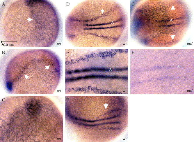 Fig. 4 Expression of prdm1 in the nervous system of wildtype and mutant nrd zebrafish embryos. Lateral views (A, B) and dorsal view(C–H) where anterior is to the left, except in A and C where anterior is to the top. (A) At 90% epiboly, expression is observed along the border of the neural plate where neural crest cells and RB sensory neurons are being specified (arrow), more strongly at the anterior-most border. At tailbud stages (B), expression remains high at the neural plate border (arrows). The expression is particularly strong at the anterior border at tail bud stages (C). (D) At 11 hpf, expression is high at the lateral edge of the neural plate (arrow; higher magnification in E), and also is expressed ventrally in the adaxial cells (A) adjacent to the midline. (F) By 13 hpf, the expression at the border of the neural plate remains only in the most posterior region (arrow). (G, H) Analysis of prdm1 expression in nrd mutant embryos at 11 hpf. Low (G) and high (H) magnification images of nrdm805 embryos showing reduced expression of prdm1, especially at the neural plate border (arrowheads in G). A slight reduction in expression is also observed in the ventral adaxial cells (A). Abbreviations: wt, wildtype; nrd, narrowminded mutant embryos; A, adaxial cells. Scale bar is 50 μm.