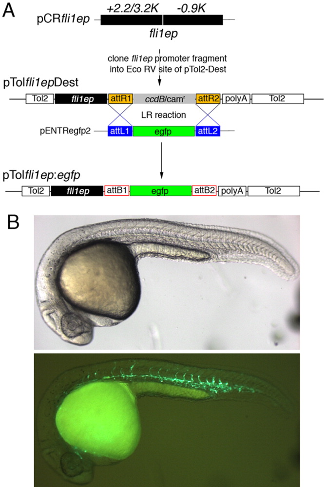 Fig. 9 Construction and use of an endothelial Tol2 Destination vector. A: Description of the construction of a Tol2-based Destination vector for generating injection constructs to drive expression in endothelial cells. B: Embryo injected with pTolfli1ep:egfp showing robust Egfp expression throughout the trunk blood vessels at 26 hours postfertilization.