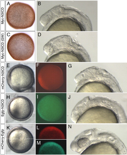 Fig. 3 Validation of Gateway compatible N-term pCS vectors. A,B: Embryo injected with myc-notch3icd mRNA from plasmid generated through standard ligation-mediated cloning. C,D: Embryos injected with myc-notch3icd mRNA from plasmid generated through Gateway cloning (GW). A,C: Embryos fixed at 50% epiboly and immunostained to detect the myc epitope; dorsal view. B,D: Live embryos at 26 hpf, lateral view, anterior to the left. E-G: Embryos injected with mRNA encoding mCherry-Notch3ICD. H-J: Embryos injected with mRNA encoding Egfp-Notch3ICD. K-N: Embryos injected with mRNA encoding an mCherry-Egfp fusion. E,H,K: Dorsal views at 50% epiboly, images generated under standard transmitted light illumination of live embryos. F,L: Visualization of red fluorescence at 50% epiboly, dorsal views. I,M: Visualization of green fluorescence, dorsal views at 50% epiboly. G,J,N: Lateral views under transmitted light, dorsal is up, anterior to the left. All embryos injected with 100 pg of indicated mRNA. N3ICD, notch3 intracellular domain.