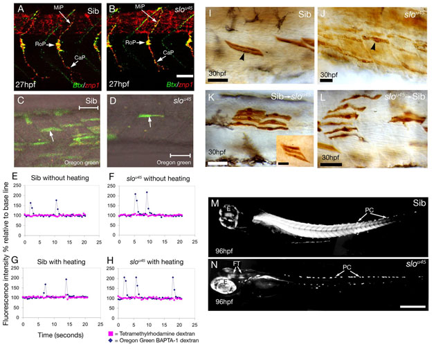 Fig. S1 The phenotype of sloθ45 mutants is intrinsic to the muscle fibres. (A,B) Confocal projections of wild-type (A) and slou45 (B) embryos stained with alpha-bungarotoxin (Btx, green) to mark motor endplates and with the ZNP1 antibody to label primary motoneuron axons (znp1, red). The trajectories of the three primary motoneuron axons (MiP, medial; RoP, rostral; CaP, caudal) in the slou45 mutant (B) are similar to its sibling (A) with multiple bungarotoxin-positive puncta (neuromuscular junctions) associated with the axons in both cases. The only defect we detected was a slight reduction in the branching of some CaP axons in the ventral myotome of slou45 mutants. Bungarotoxin-positive spots are also evident in the furrow between the myotomes as noted previously (Behra et al., 2002; Lefebvre et al., 2007). (C-H) Calcium fluxes in the muscle of slou45 mutants are normal. (C,D) Muscle fibres (arrows) labelled with the calcium-sensitive dye Oregon-Green 488 BAPTA-1 dextran co-labelled with tetramethylrhodamine-dextran (to detect calcium-insensitive fluorescent changes) in myotomes of a slou45 mutant (D) and a sibling (C). Recordings of fluorescence in fibres from a mutant (F,H) and a sibling (E,G) with and without an external stimulus of heating show no differences except that transients are slightly larger in the mutant because movement in wild types took the dye-containing cells out of focus. To control for this movement, the ratio of peaks in calcium and rhodamine fluorescence was calculated (see Table S1). (I-L) Muscle fibres of slou45 mutants have abnormal morphologies. (I,J) Mosaic labelling of muscle cells by injection of biotinylated dextran and ABC Kit (Vector labs) and DAB in a sibling (I) and a slou45 mutant (J). slou45 muscle fibres have an inconsistent, uneven and wavy morphology lacking crisp attachments at the myotome boundaries, in contrast to the regimented, straight and crisply attached appearance of muscle fibres in siblings. (K,L) The slou45 mutation has a cell-autonomous effect. Dextran-labelled cells were transplanted from/to wild-type and slou45 embryos at 30% epiboly, fixed and stained at 24-36 hpf. Most wild-type sibling muscle cells show near-normal morphology in a slou45 mutants (K), although isolated wild-type cells tended to have a slightly defective morphology - when the cells grouped together (inset), their morphology is more normal. slou45 mutant cells in a wild-type sibling show abnormal morphology (L) similar to non-transplanted mosaically labelled mutant cells (compare with J). This suggests that the slo phenotype is primarily due to a cell-autonomous defect with only minor, likely secondary, non-autonomous defects. (M,N) Lateral views of trunk muscles of a slou45 mutant (N) and a sibling (M) visualised with polarised light. Muscle fibres in the wild type are highly birefringent, whereas in the slou45 mutant, the muscle completely lacks birefringence. Birefringence is still seen in the pigment cells (PC), eye (E) and in fibre-tracts of the brain (FT) and appears brighter in mutants due to longer photographic exposure. Scale bars: 20 μm in A,B,I-L; 50 μm in C,D; 200 μm in M,N.
