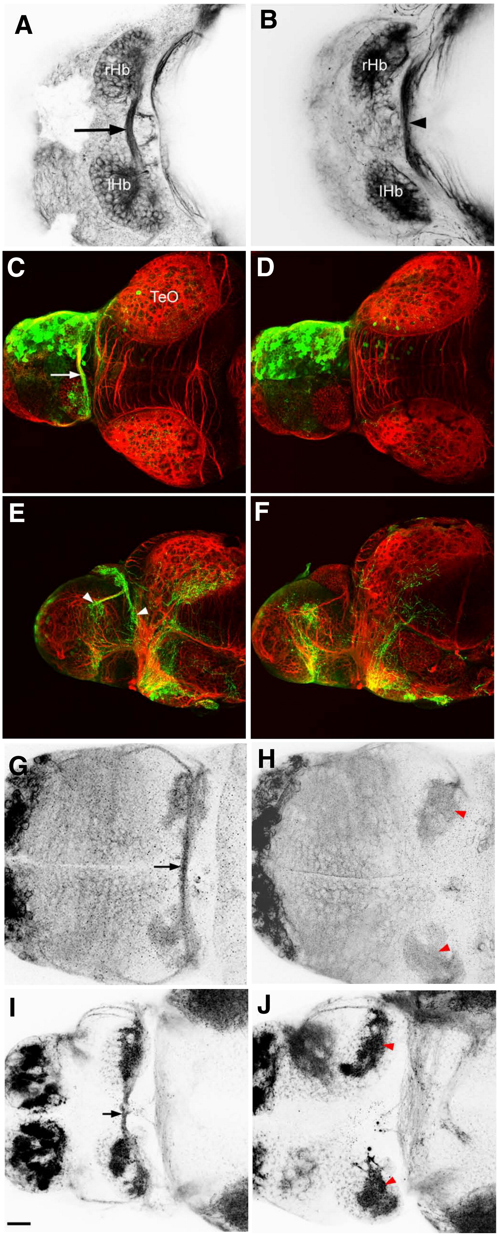 Fig. 2 The habenular commissure is absent in esrom mutants. (A) Axon tracts in the dorsal forebrain of 3 dpf wt embryo, visualized with an antibody to acetylated tubulin. The habenular commissure (arrow) is visible between the left and right habenulae. (B) An esrom mutant at 3 dpf. The habenular commissure is absent. The posterior commissure is indicated (arrowhead). (C–F) Unilateral electroporation with eGFP, showing the presence of the habenular commissure (arrow, C) and contralateral terminations (arrowheads, E) in a wild type embryo. These are absent in an esrom mutant (D, F). Habenular afferents can be visualized with an antibody to mGluR2/3 (G, H) or SV2 (I, J). The commissure is visible in wild types (arrow, G, I). In mutants (H, J), axons terminate in the ipsilateral neuropils (red arrowheads). All embryos are shown in dorsal view, except panels E and F which are lateral views. rHb: right habenula; lHb left habenula; TeO: tectum opticum. Scale bar = 20 μm.