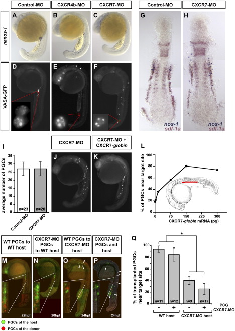 Fig. 2 CXCR7 Is Essential for Normal PGC Migration and Is Required in the Somatic Environment of the Embryo (A–C) Reduction of CXCR7 activity leads to aberrant PGC migration as demonstrated by in situ hybridization using a germ cell-specific nanos1 probe. PGCs in control embryos cluster at the region where the gonad develops after 20 hr of development (A). Similar to reduction of CXCR4b activity (B), knockdown of CXCR7 results in a pronounced germ cell migration phenotype (C). (D–F) CXCR7 knockdown does not affect PGC specification. Images of 22 hpf embryos injected with Vasa-GFP-nos1-3′ UTR mRNA are shown. Germ cell-specific mRNA protection and proper localization of the Vasa-GFP fusion protein to germinal granules is observed in embryos injected with control morpholino (D), CXCR4b morpholino (E), and CXCR7 morpholino (F). (G and H) General embryonic patterning and expression of sdf-1a are not affected by CXCR7 knockdown. Two-color in situ hybridization using nanos1 (blue) and sdf-1a probes (red) of embryos injected with control (G) or CXCR7 (H) morpholino is shown. (I) CXCR7 knockdown does not affect PGC number as counted at 12 hpf. n signifies the number of embryos examined. Error bars represent standard error of the mean (SEM). (J–L) The effect of CXCR7 morpholino on PGC migration is reversed by CXCR7 expression. The severe migration phenotype induced by the CXCR7 antisense oligonucleotide (J) is reversed by global expression of RNA encoding CXCR7 (K). A graph demonstrating the dose-dependent rescue of the CXCR7 morpholino-induced phenotype by global expression of CXCR7 (L). For all injections the total amount of injected mRNA was identical (300 pg) by addition of control mRNA (mCherry-F-globin mRNA). The red bar indicates the correct target for the migrating PGCs. (M–Q) PGC migration depends on the activity of CXCR7 in somatic tissues. PGCs expressing DsRedExpress (red) were transplanted into embryos with PGCs expressing EGFP-F (green). Wild-type and CXCR7 knocked-down PGCs arrived at the region of the gonad in wild-type hosts (M and N). A large proportion of wild-type and CXCR7-depleted PGCs does not arrive at the correct target in CXCR7-depleted host embryos (O and P, arrowheads). In (Q), the percent of transplanted PGCs reaching their target after the first day of development isrge proportion of wild-type and CXCR7-depleted PGCs does not arrive at the correct target in CXCR7-depleted host embryos (O a shown. PGCs in CXCR7-depleted hosts embryos show a significant reduction of migration fidelity as compared to PGCs in wild-type hosts (p < 0.001, t test, marked with an asterisk). PGCs deficient for CXCR7 do not show a significant difference in arriving at the target as compared to control PG