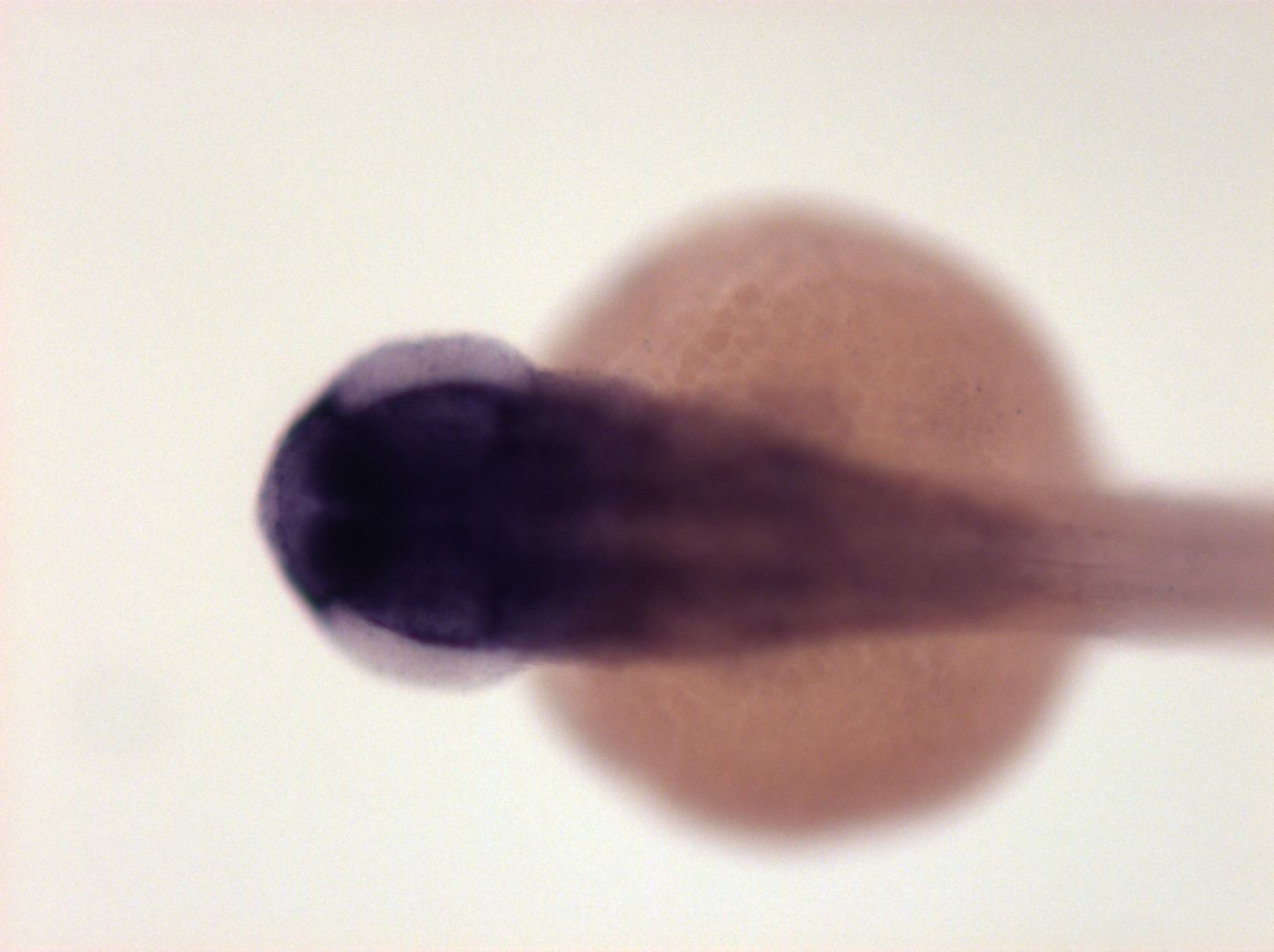 Fig. 5 head dorsal epidermis, forebrain ventricular zone, tegmentum, MHB, hindbrain, caudal vein, heart