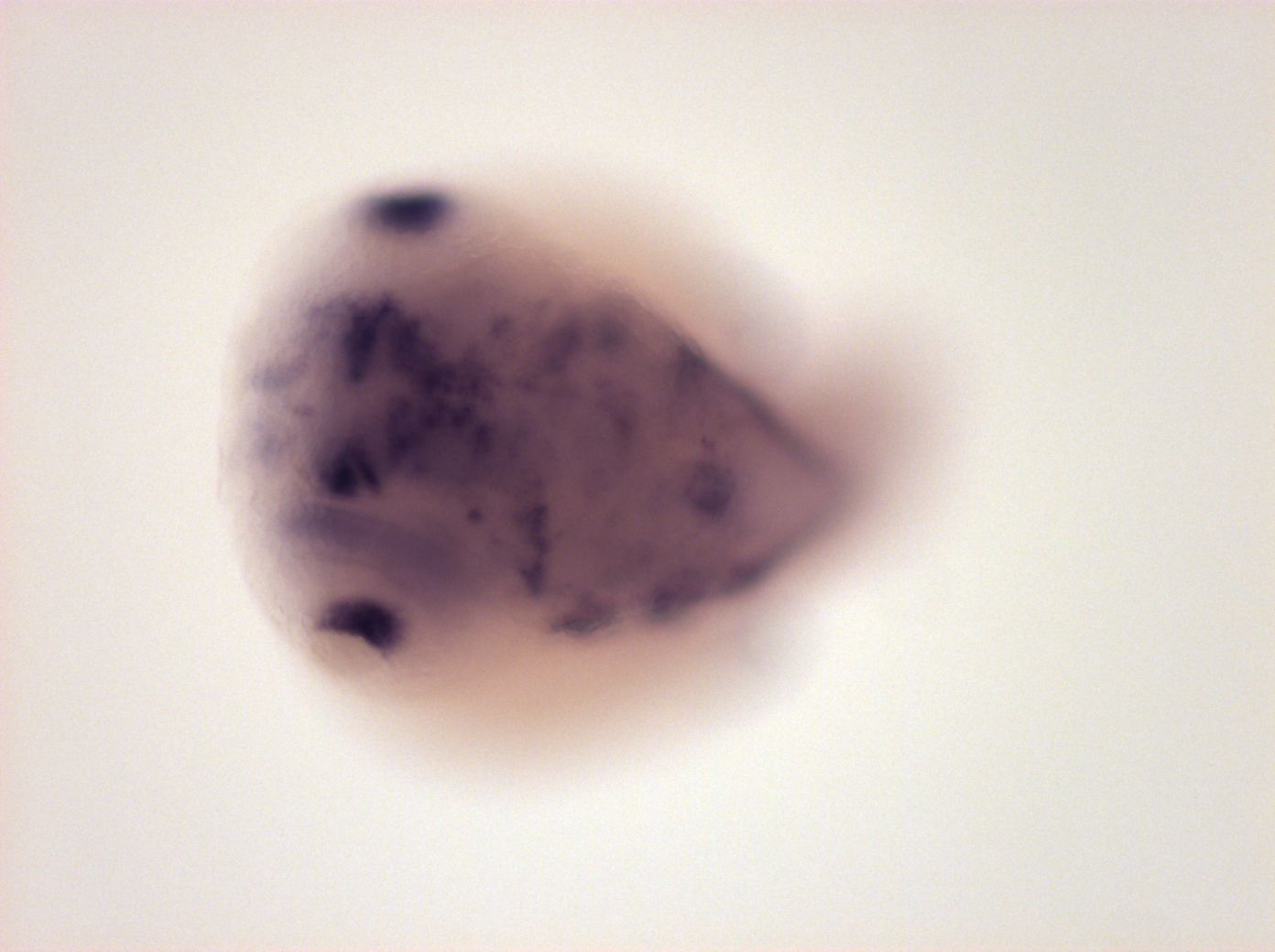 Fig. 6 median fin fold, AER pectoral fin, dorsal part of retina (more in lens), dorsal otic vesicle, dorsal hindbrain, dorsal midline midbrain, tegmentum, nucleus in diencephalon.