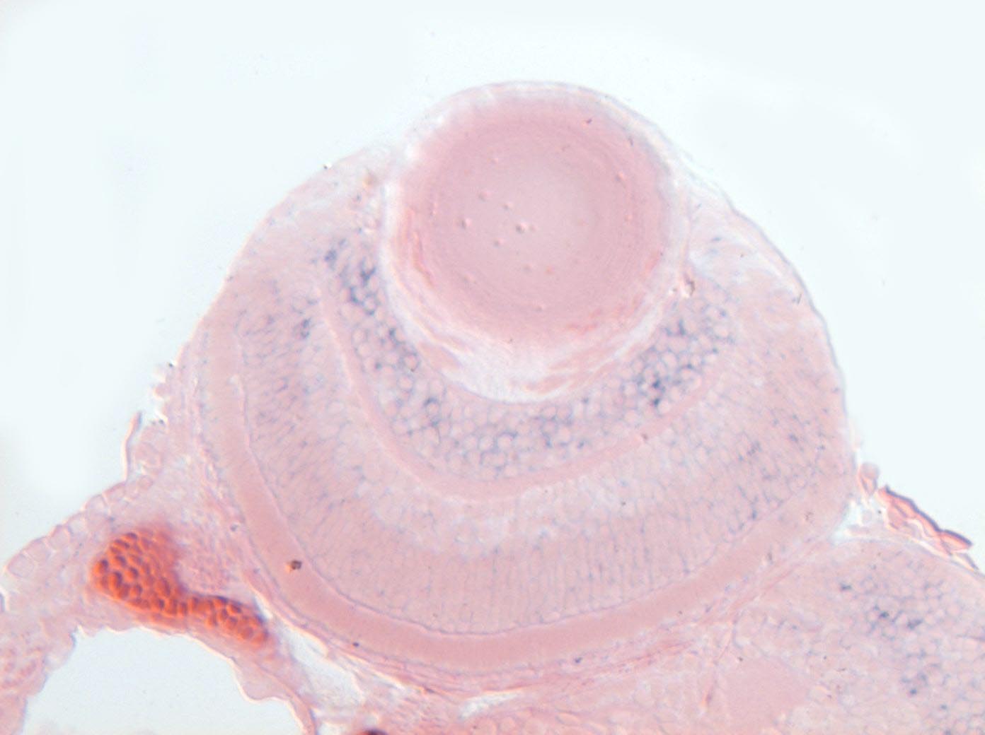Fig. 6 Expressed in retina, tectum and hindbrain. In retina, expression is observed in ganglion cell layer and inner nuclear layer except in the proliferative zone. Labelling is stronger in the ganglion cell layer.