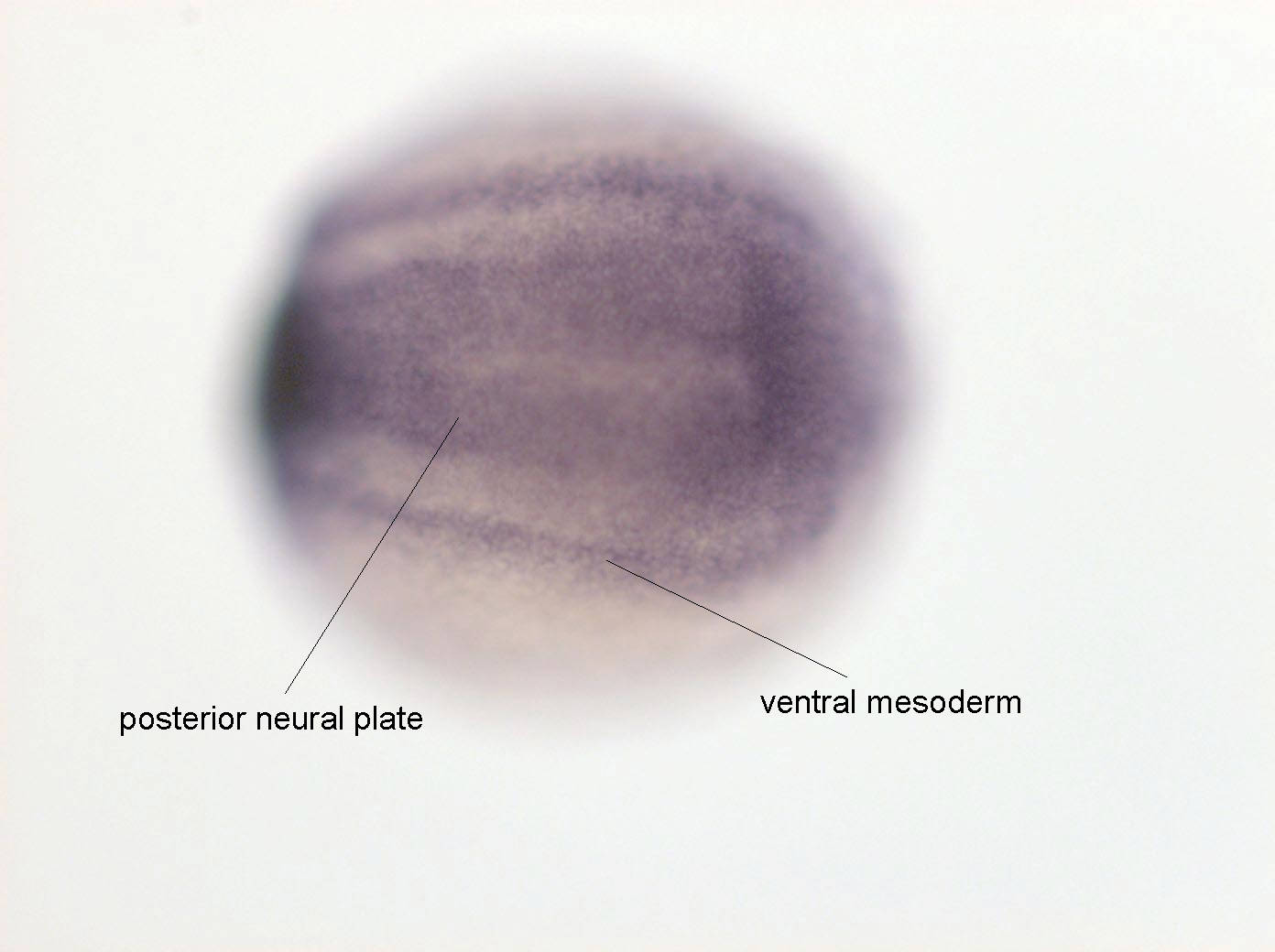 Fig. 2 Expressed in the neural plate at the level of the forebrain-midbrain boundary in presumptive posterior diencephalon, in hindbrain with a stronger expression in rhombomere 5 and in presumptive spinal chord. Also expressed in ventral mesoderm