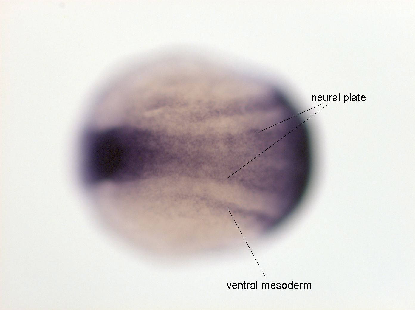 Fig. 2 Expressed in the neural plate at the level of the forebrain-midbrain boundary in presumptive posterior diencephalon, in hindbrain with a stronger expression in rhombomere 5 and in presumptive spinal chord. Also expressed in ventral mesoderm