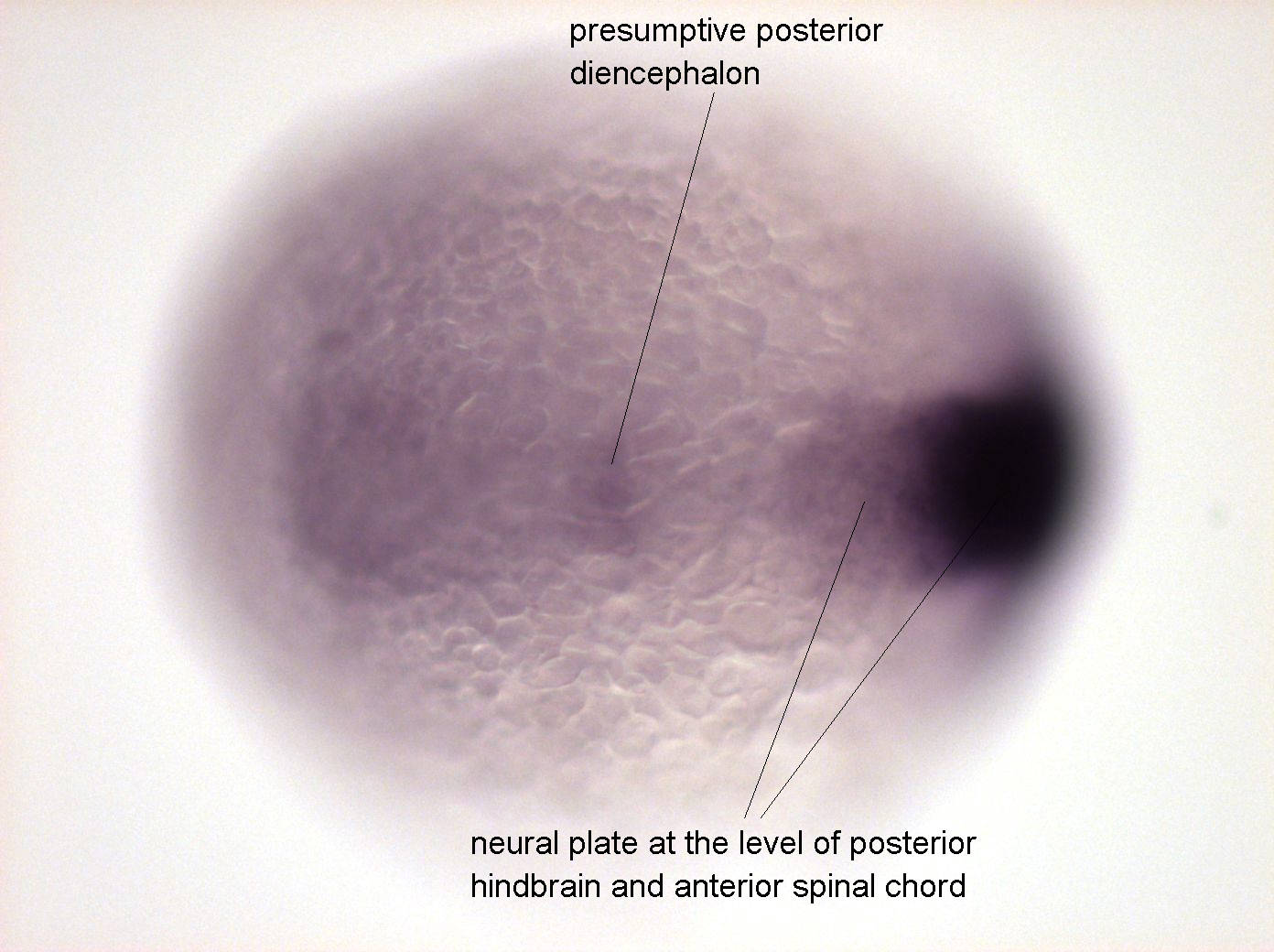 Fig. 2 Expressed in the neural plate at the level of the forebrain-midbrain boundary in presumptive posterior diencephalon, in hindbrain with a stronger expression in rhombomere 5 and in presumptive spinal chord. Also expressed in ventral mesoderm