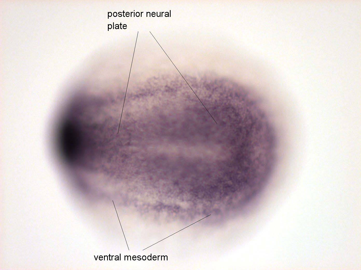 Fig. 2 Expressed in the neural plate at the level of the forebrain-midbrain boundary in presumptive posterior diencephalon, in hindbrain with a stronger expression in rhombomere 5 and in presumptive spinal chord. Also expressed in ventral mesoderm