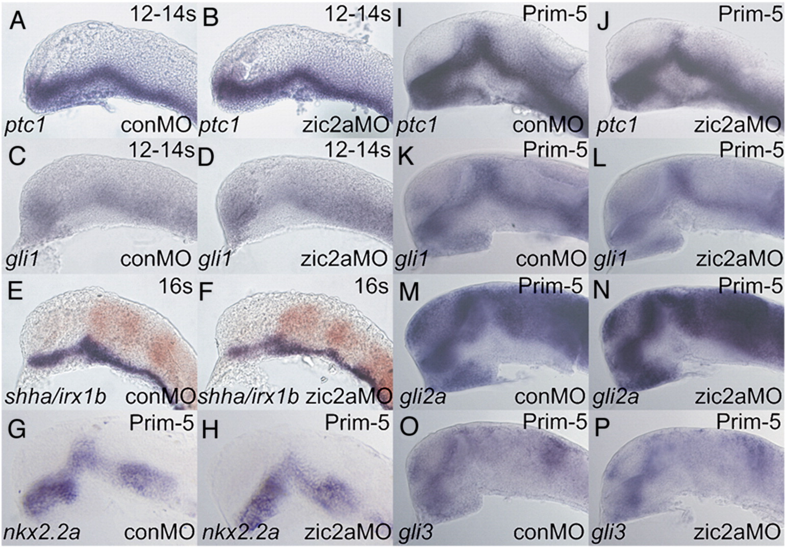 Fig. 7 Zic2a controls PT patterning independent of hedgehog signaling. Embryos were injected with conMO or zic2aMO, and examined by ISH for expression of the following markers, which were expressed correctly in zic2a moprhants. (A, B) ptc1 at 12ā14s (20/20 morphants, 2 exp.). (C, D) gli1 at 12ā14s (9/9 morphants, 2 exp.). (E, F) shha at 16s (38/38 morphants, 2 exp.). (GāP) Embryos are at Prim-5 (see Supplementary Table 1 for numbers). (G, H) nkx2.2a. (I, J) ptc1. (K, L) gli1. (M, N) gli2a. (O, P) gli3. Embryos are shown in lateral views, anterior to the left.