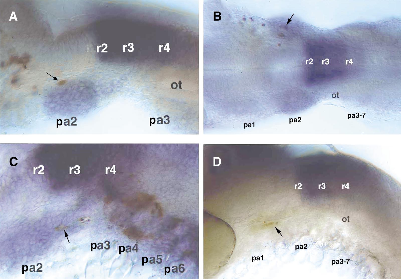 Fig. 6 Transplanted cells from the hoxa2-negative r6/r7 level upregulate expression of hoxa2 when placed at r4/r5 levels, but not elsewhere. Left side (A, C, D) or dorsal (B) views. Transplanted cells were detected for biotinylated lineage tracer (brown) after gene expression was assayed by in situ hybridization. (A) Transplanted cells contributing to the second pharyngeal arch (pa2) stream of hoxa2+ migrating neural crest express hoxa2. (B) Transplanted cells contributing to the first (pa1) and second (pa2) arch streams express hoxa2 only in the second arch. (C) Transplanted cells contributing to the second and more posterior arches express hoxa2 in the second (pa2) arch. (D) Cells transplanted from r4/r5 levels into the first pharyngeal arch (pa1) are hoxa2-negative.