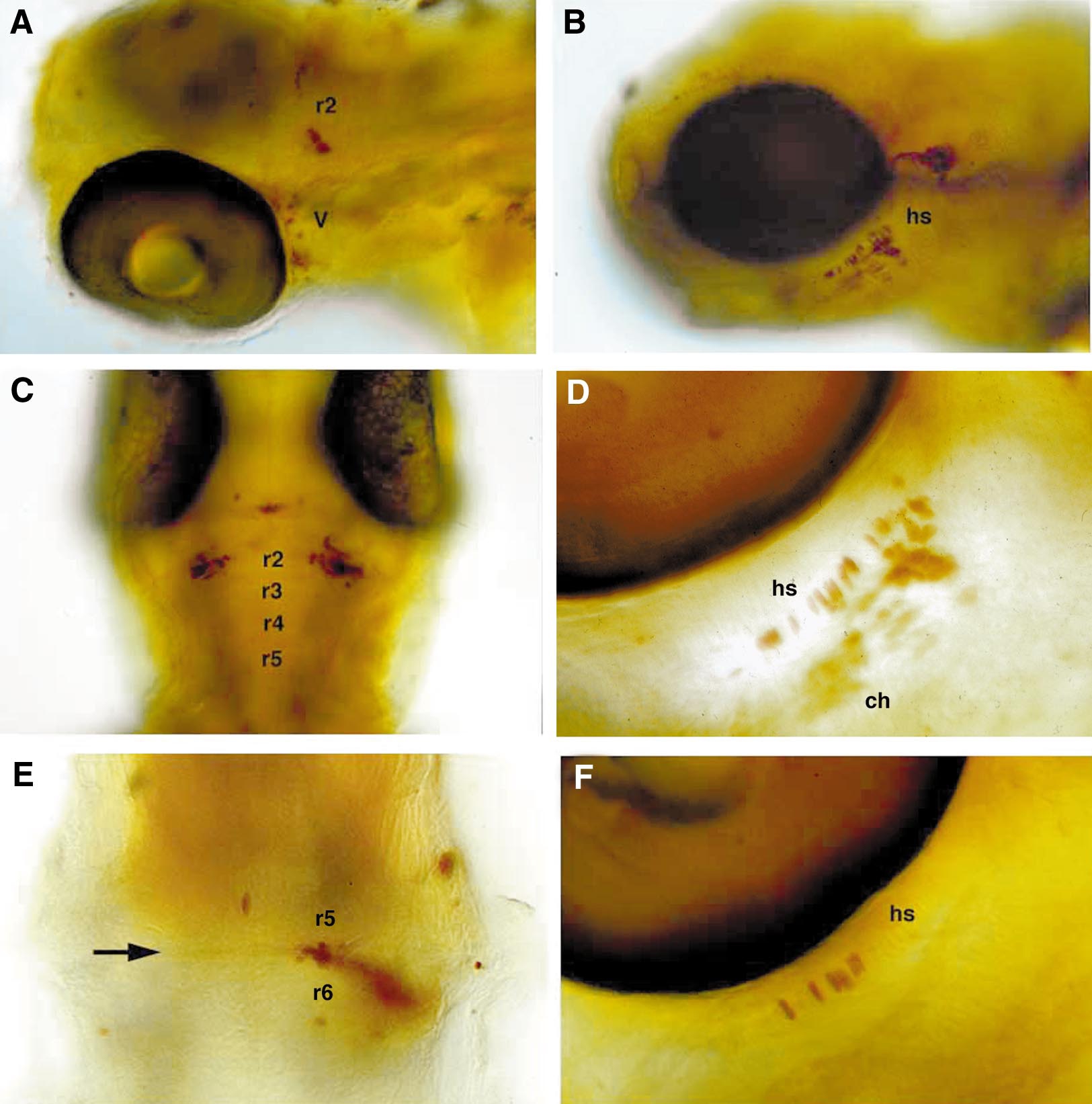 Fig. 9 Cells transplanted along the AP axis regulate their segment-specific skeletal and neural fates. 72-h-old larvae containing transplants were stained for the biotinylated lineage tracer (brown). Left (A, C, E) shows neural derivatives; right (B, D, F) shows skeletal derivatives. (A) Dorsolateral view of cells transposed from r5/6 to r2. Some neural crest cells contained in the same transplant contributed neurons to the trigeminal ganglion of the first arch (V). (B) Lateral view of neural crest transplanted from the r5/6 level to the r3/4 level that contributed to the hyosymplectic cartilage (hs) of the second arch. (C) Dorsal view (anterior to the top) of cells transposed from r5/6 to r2 that contributed bilaterally to r2. (D, F) Ventrolateral views of cells transplanted from r5/6 (D) or r7 (F) that contributed to second arch cartilages. (E) Dorsal view (anterior to the top) of commissural interneurons between r5 and r6, transposed posteriorly from r2/3. Abbreviations: hs, hyosymplectic; ch, ceratohyal; V, trigeminal ganglion.