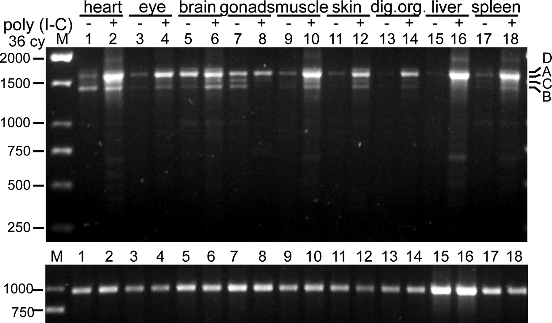 Fig. 2 Expression pattern of PKZ 12 h after induction by poly(I:C). RT-PCR was performed on the indicated tissues, by using primers covering the complete ORF. The constitutively expressed receptor for activated C kinase 1 (RACK1) is shown as a loading control at the bottom. Expression patterns in tissues from untreated animals are in Fig. 9.