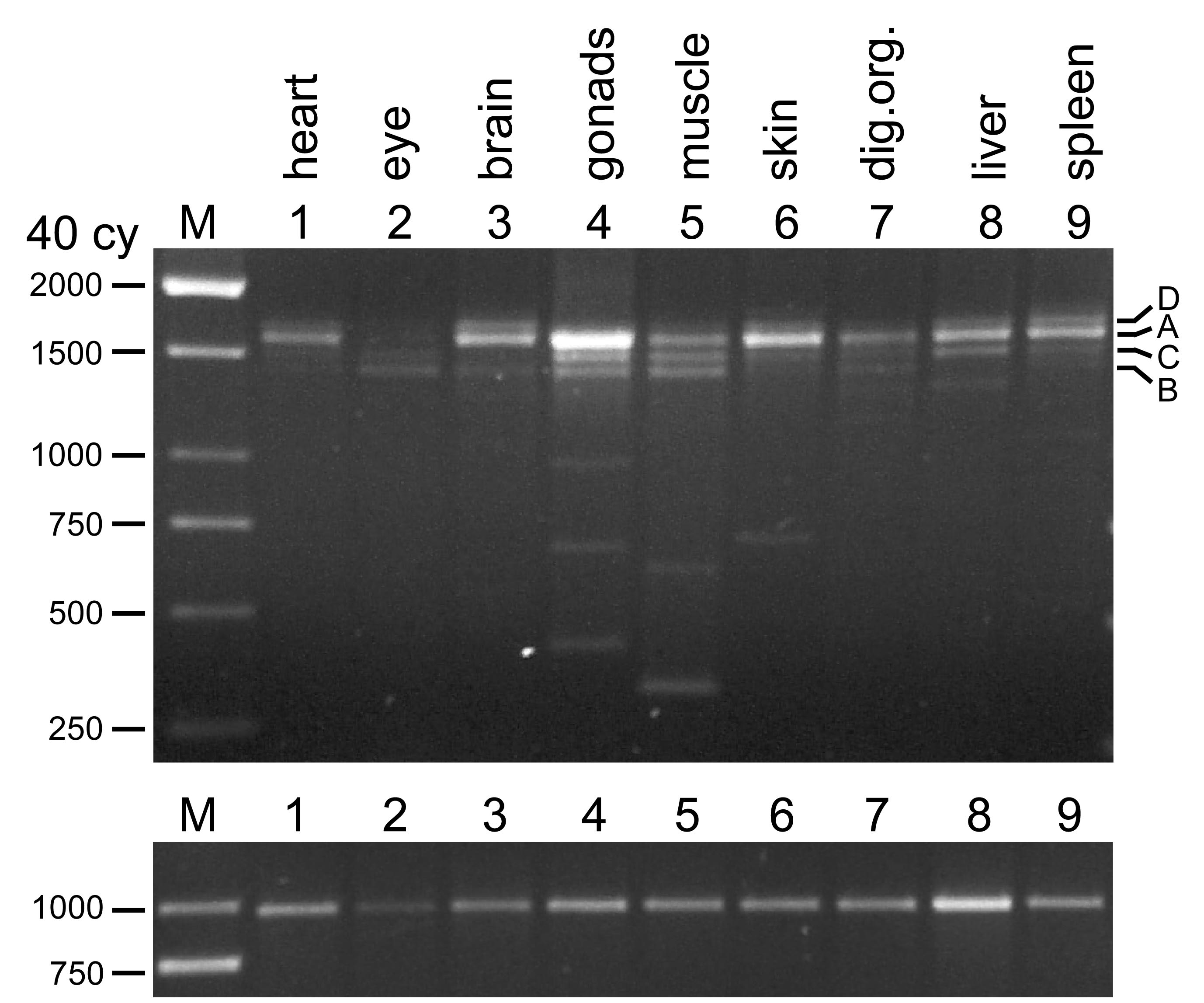 Fig. 11 Expression of drPKZ in tissues from untreated animals. Splice variants A–D are marked on the right. Lower shows the expression of the constitutively expressed receptor for activated C kinase 1 (RACK1) as a control.