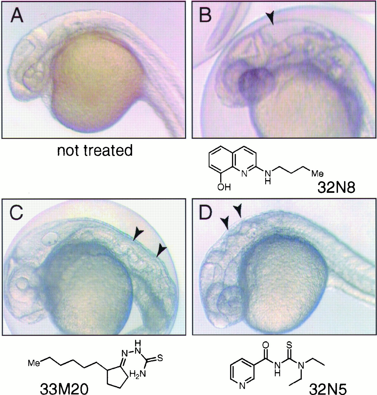 Fig. 1 Small molecules alter development of the central nervous system. (A) Untreated zebrafish embryo. (B) Embryo treated with the small molecule 32N8 at a concentration of 2 μg/ml. The enlarged hindbrain ventricle is indicated by an arrowhead. (C) Embryo treated with the small molecule 33M20 (2 μg/ml). The folds in the notochord are indicated by arrowheads. (D) Embryo treated with the small molecule 32N5 (2 μg/ml). Hindbrain projections are indicated by arrowheads. All embryos were photographed 25 hpf.